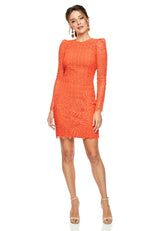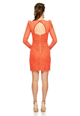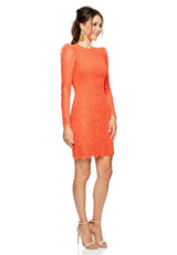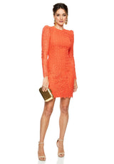 The Mae Lace Mini by Rebecca Vallance is cut from bright orange corded lace which skims over the body. The fullness in the shoulder creates a feminine silhouette, while the scalloped hem and open back add a modern touch to this classic lace dress.